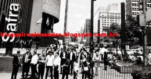 No mais, fiz fotos dos prédios grandes dos bancos e também usei esses prédios enormes da Avenida Paulista em contraste com os executivos atravessando a rua, durante o horário comercial.